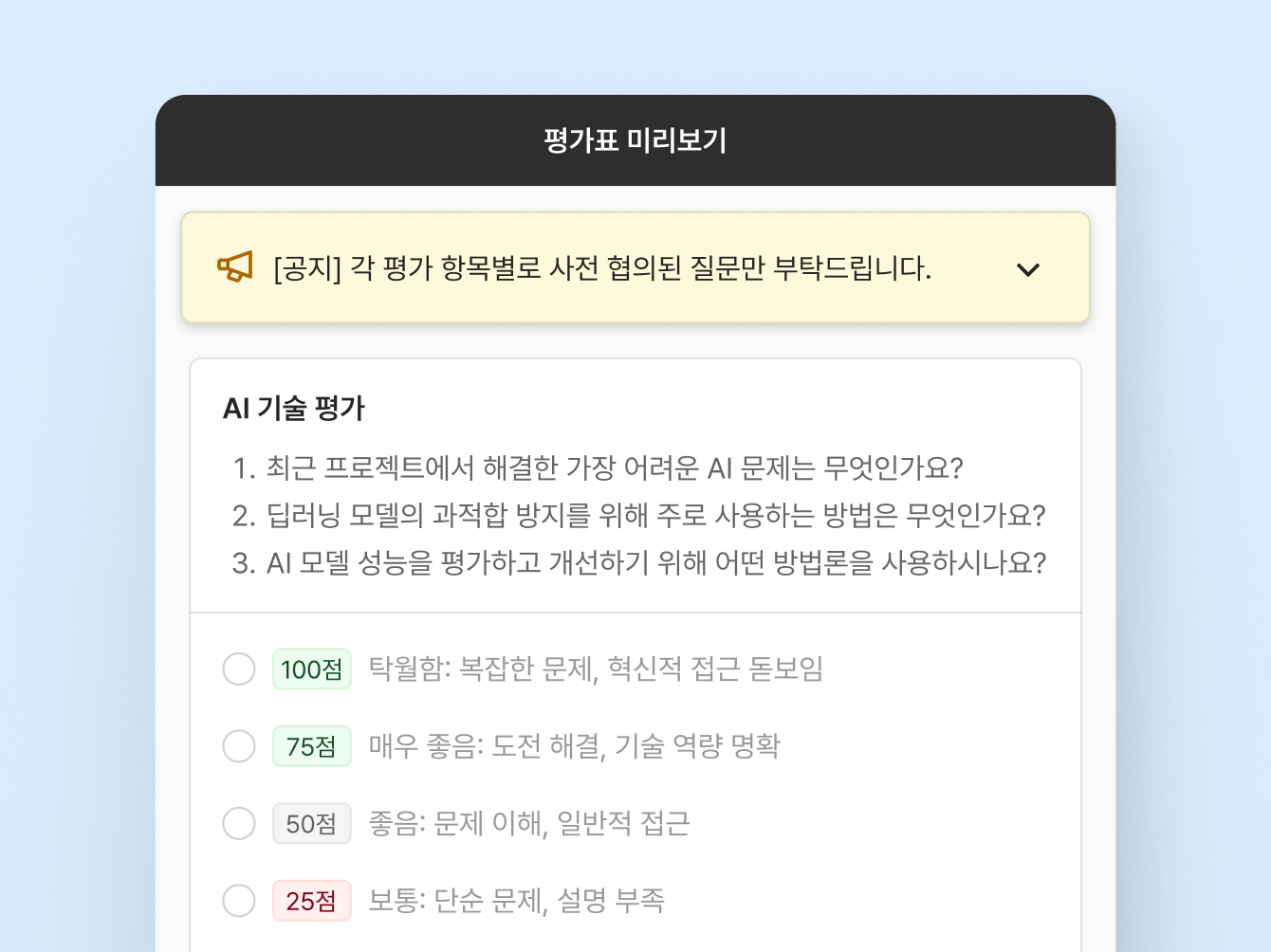 - 객관적인 합불 근거 마련: 각 평가자가 느끼는 단편적인 인상에 의존하지 않고, 다수의 피드백을 모아 후보자를 다각도로 분석하고 객관적인 합불 근거를 마련합니다.