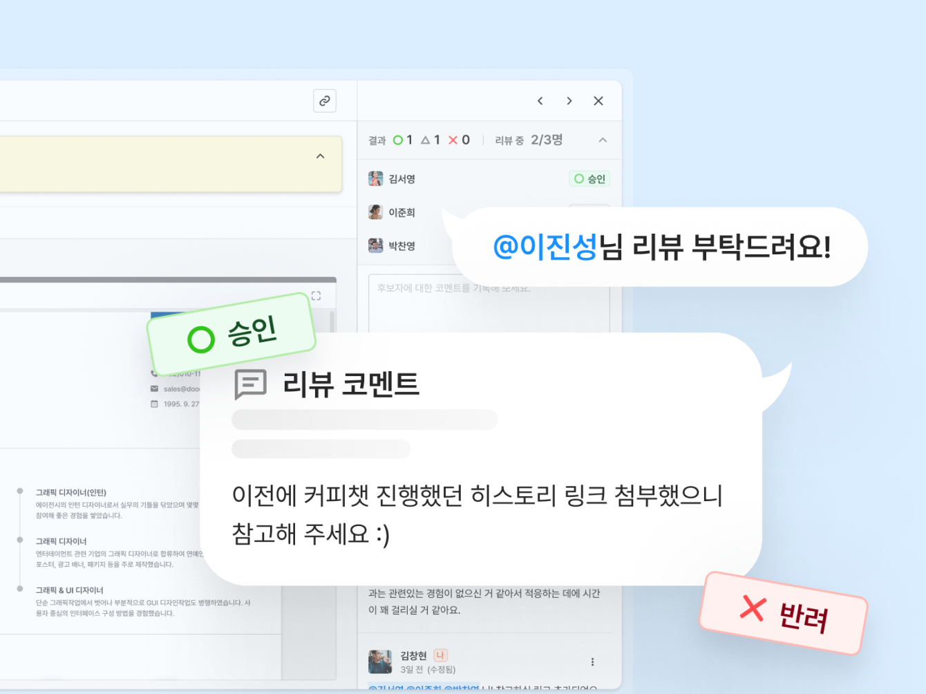AI 서류평가 기능으로 1차 스크리닝된 서류를 채용 담당자 혼자 검토하기보다 현업들과 함께 평가하는 프로세스를 구축해 보세요. 현업의 시선으로 다시 한번 살필 때 AI 작성으로 의심되는 포인트를 가장 정교하게 잡아낼 수 있습니다.