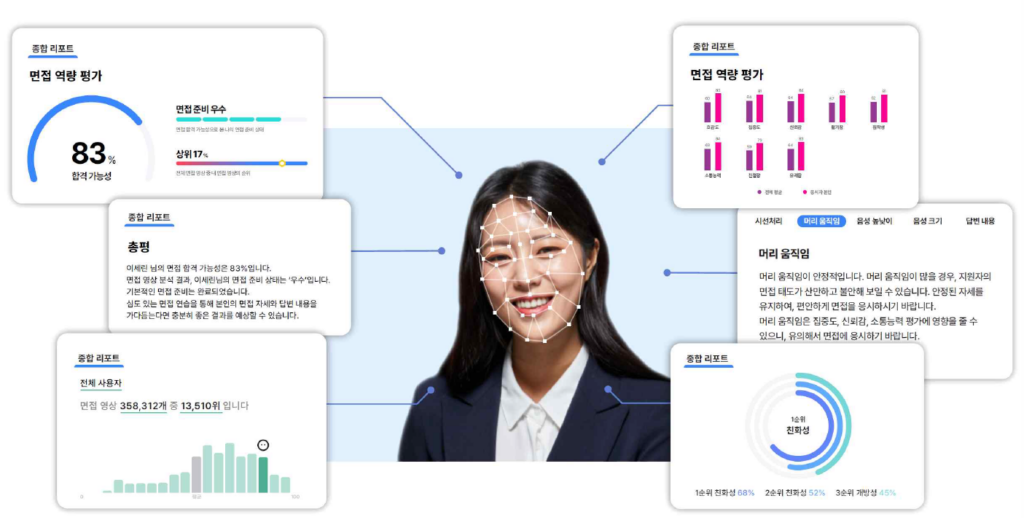 - 비언어적 신호 분석: 영상 면접을 통해 지원자의 답변 내용뿐만 아니라 시선 처리, 미세 표정, 음성 패턴 등을 분석합니다. 서류상에서는 '대규모 프로젝트 리딩'을 주장했으나 관련 질문에 지나치게 당황하거나 불안정한 시선을 보인다면 서류 내용과 실제 경험 사이의 불일치 시그널로 판단할 수 있습니다.