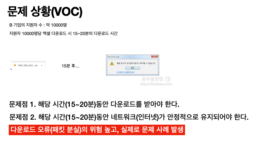 저희 고객 기업인 A사에서 1만 명의 지원자 데이터를 Excel로 다운로드하고 싶다는 니즈가 있었어요.