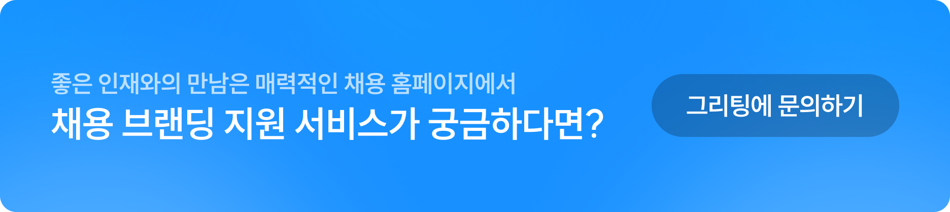 채용 홈페이지는 단순한 정보의 집합소가 아닌 채용 브랜딩의 핵심 도구입니다. 공고는 업무 내용, 자격 요건 등을 확인하는 창구지만, 채용사이트는 이를 넘어서서 회사가 전반적으로 어떤 곳인지 알아보는 공간이기 때문입니다. 그리팅이 다양한 고객사의 채용 홈페이지 제작을 지원하는 이유이기도 하죠.