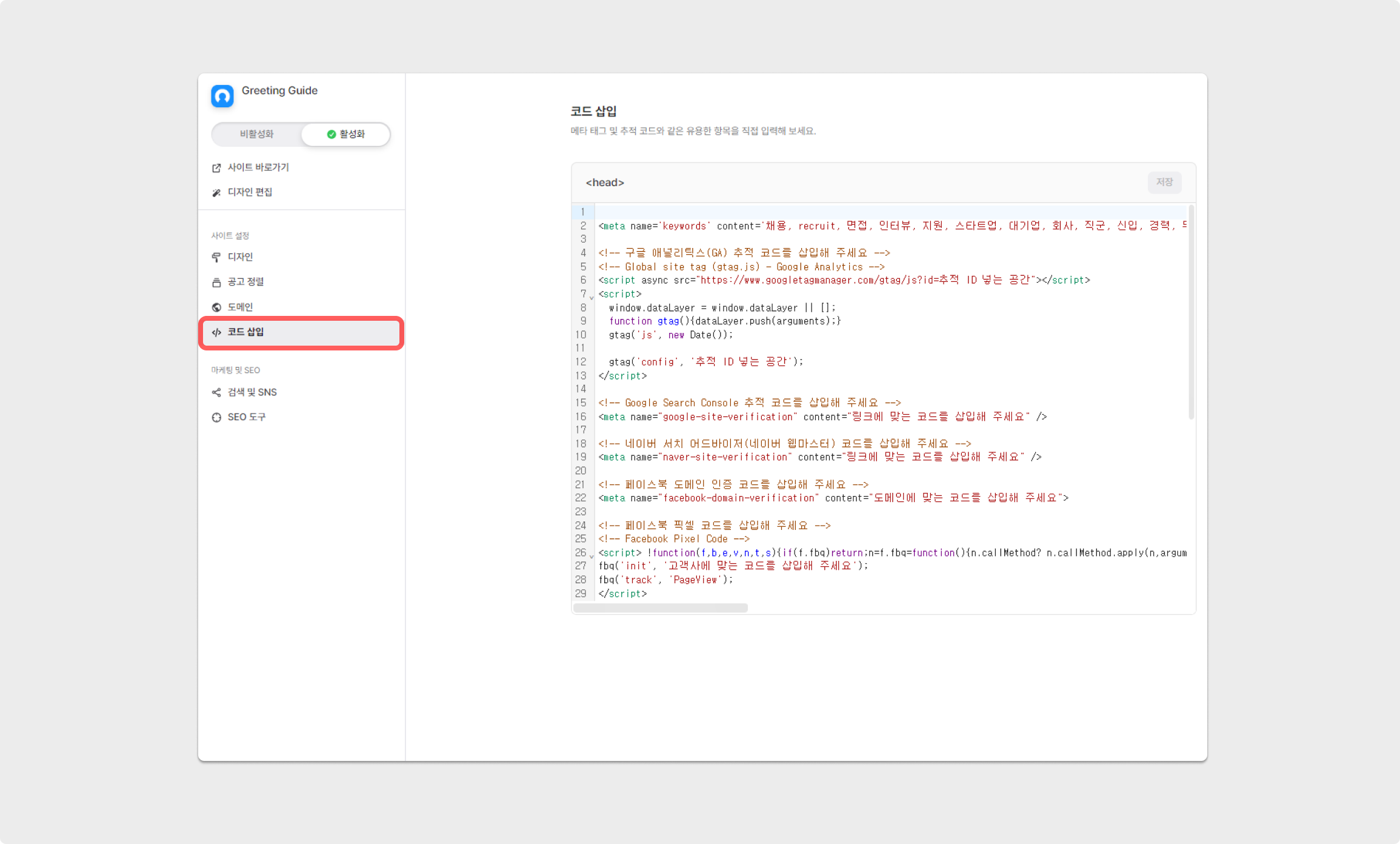 Google Analytics를 이용하기 위한 추적 CODE 삽입이 가능합니다. 추적 CODE 삽입은 채용사이트 설정에서 설정 가능합니다.