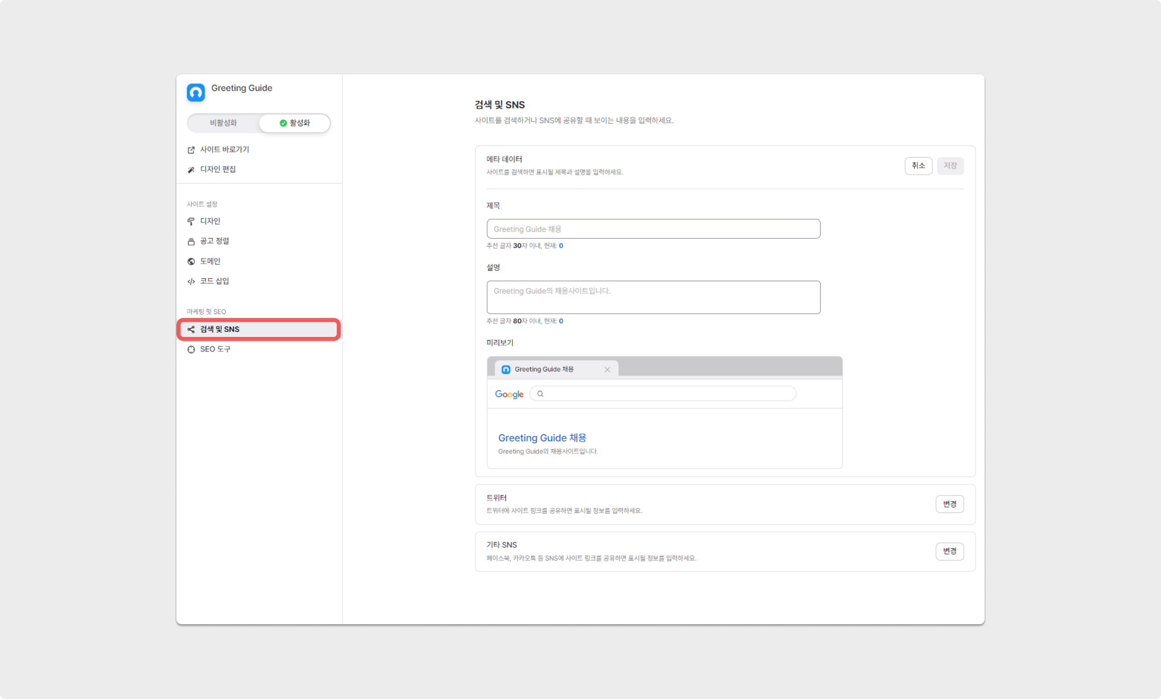 채용 사이트 상단 탭에 표시될 브라우저 탭 제목을 설정할 수 있습니다. 브라우저 탭 제목은 채용사이트 설정에서 설정 가능합니다