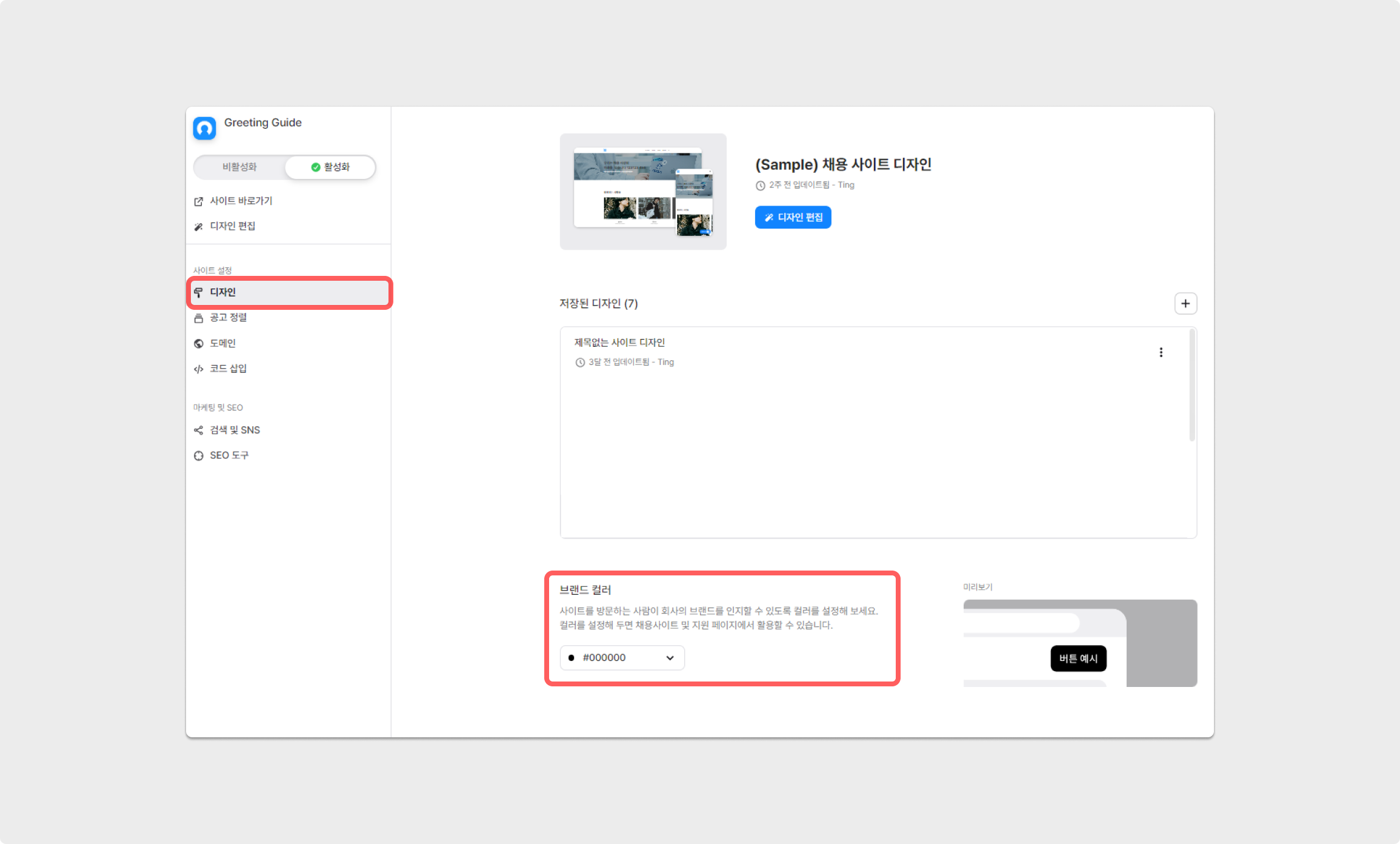 브랜드 컬러를 설정할 수 있습니다. 브랜드 컬러를 설정시 채용 사이트 헤더의 채용 중인 공고 버튼의 색상과 공고 페이지에서 지원하기 버튼 등의 컬러가 적용됩니다. 브랜드 컬러는 채용사이트 설정에서 설정 가능합니다.