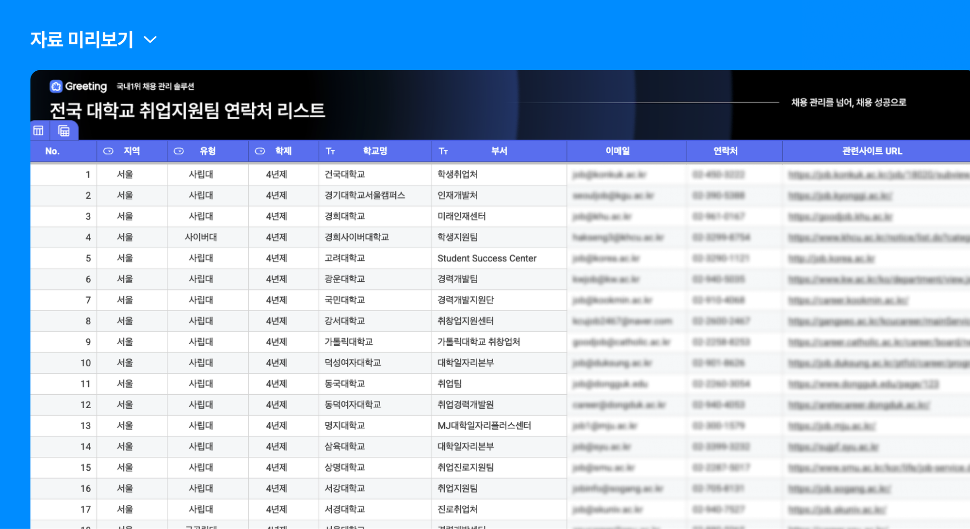 전국 296개 대학의 취업지원실 연락망과 게시 경로도 함께 확인해 보세요. 신입 채용 시 학교별로 채용 소식을 전달하거나 산학협력 및 채용 홍보를 진행할 때 꼭 필요한 정보입니다.