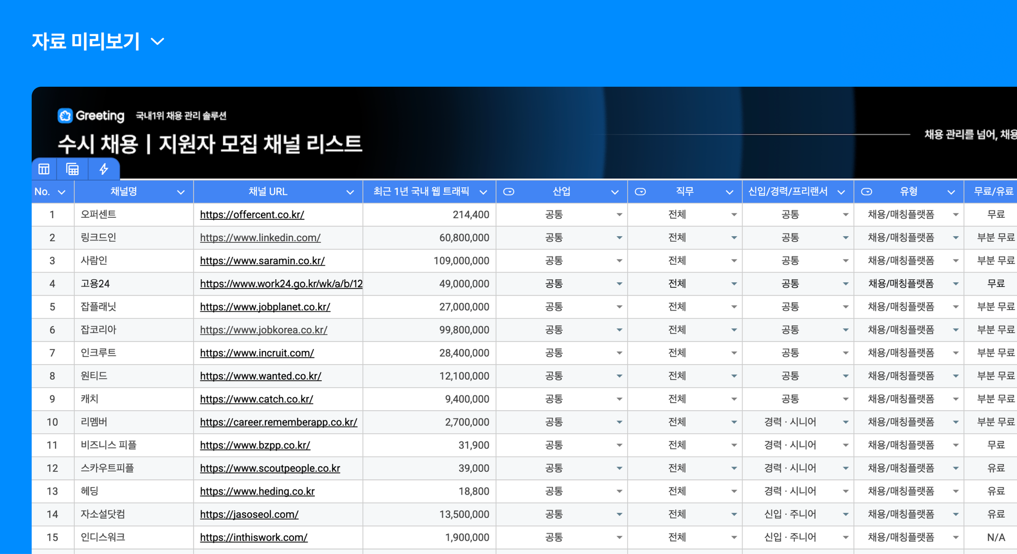 산업별·직무별 평균 20개 이상, 총 300개 이상의 수시채용 지원자 모집 채널을 총망라했습니다. 단순히 플랫폼 목록이 아니라 각 채널의 성격, 연간 트래픽, 주요 직무 유입 경향까지 확인해 보세요.